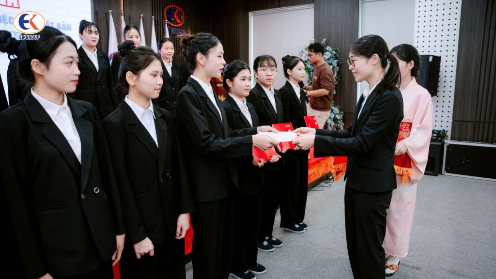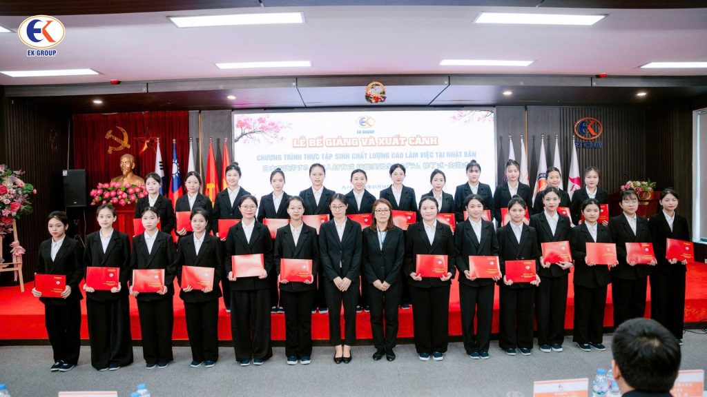 Trong không khí trang trọng và ấm áp, buổi lễ có sự tham dự của Ban Lãnh đạo EK GROUP, đội ngũ cán bộ quản lý, cán bộ đào tạo, quý thầy cô giáo, phụ huynh học viên, cùng đại diện Xí nghiệp tiếp nhận và Nghiệp đoàn đến từ Nhật Bản.