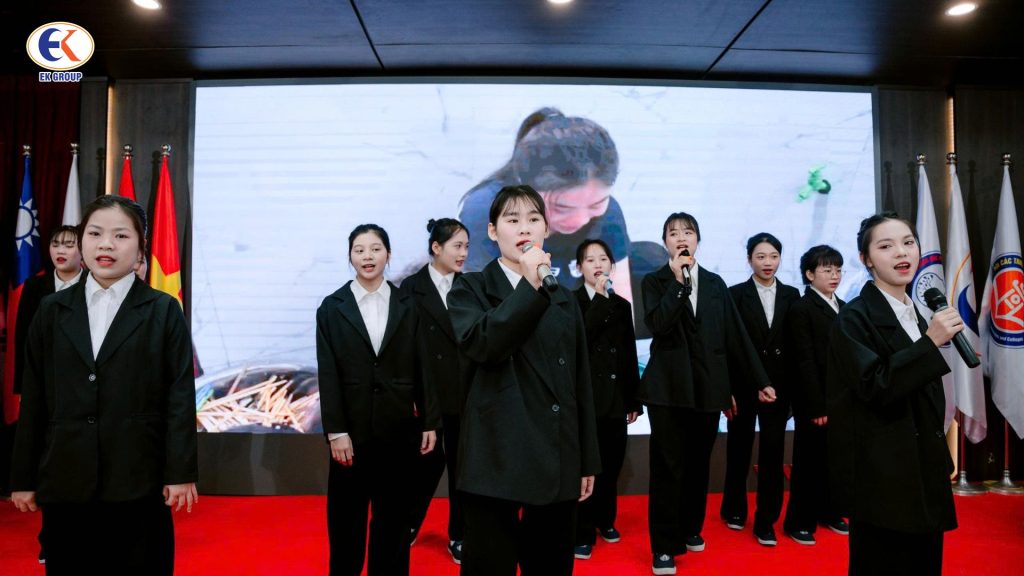 Một trong những khoảnh khắc xúc động nhất của buổi lễ là phần đại diện học viên xuất cảnh phát biểu tri ân, gửi lời cảm ơn sâu sắc tới Ban Lãnh đạo EK GROUP, đội ngũ cán bộ quản lý, cán bộ đào tạo, các thầy cô giáo và gia đình – những “hậu phương vững chắc” đã luôn đồng hành trong suốt hành trình vừa qua.