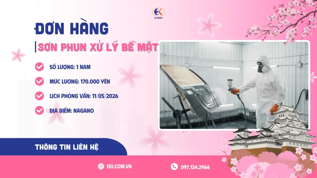 EK GROUP tuyển dụng 1 nam nhân viên sơn phun xử lý bề mặt sản pẩm làm việc tại Nagano trong 3 năm với mức lương hấp dẫn. Đăng ký ngay!